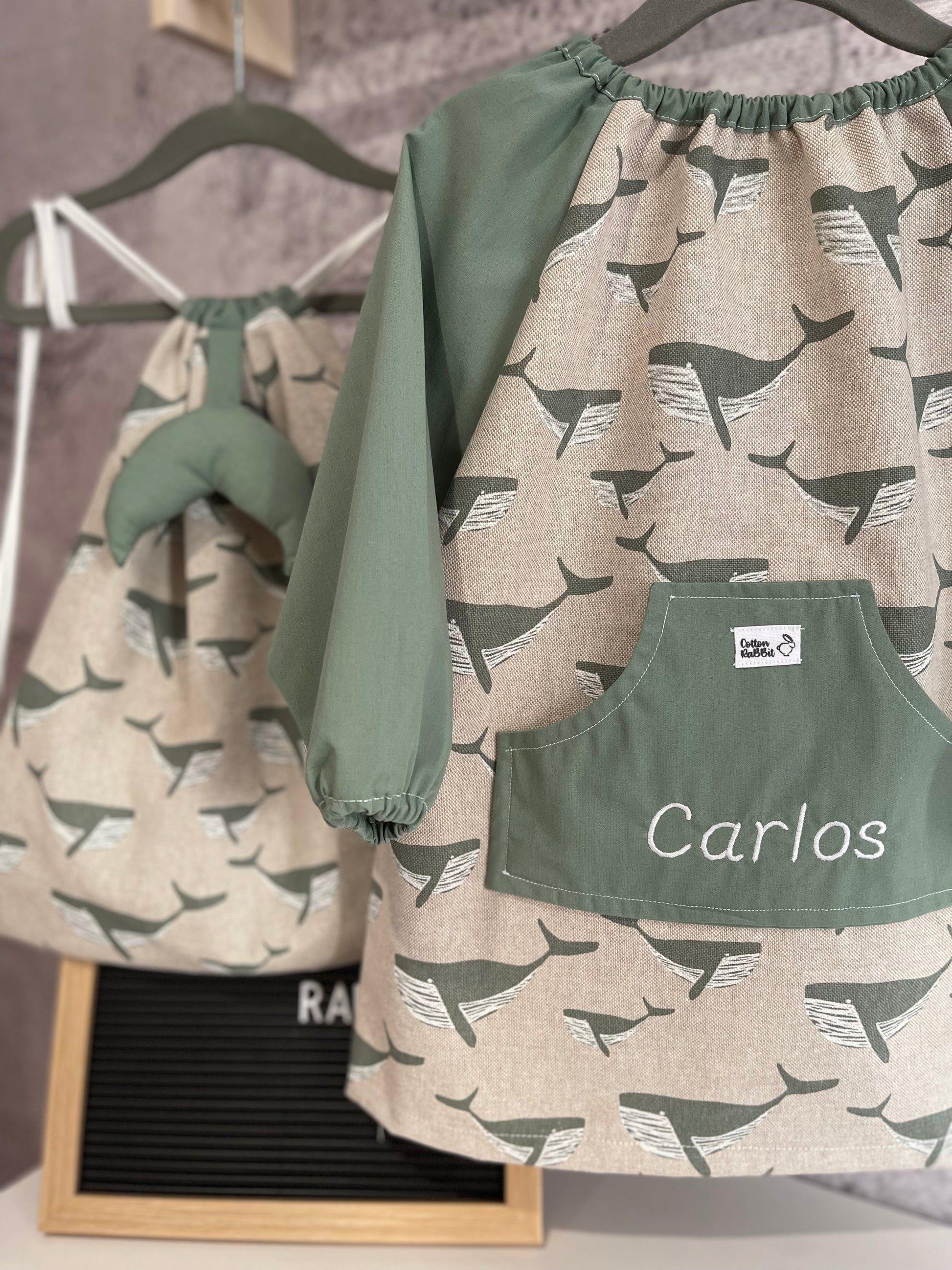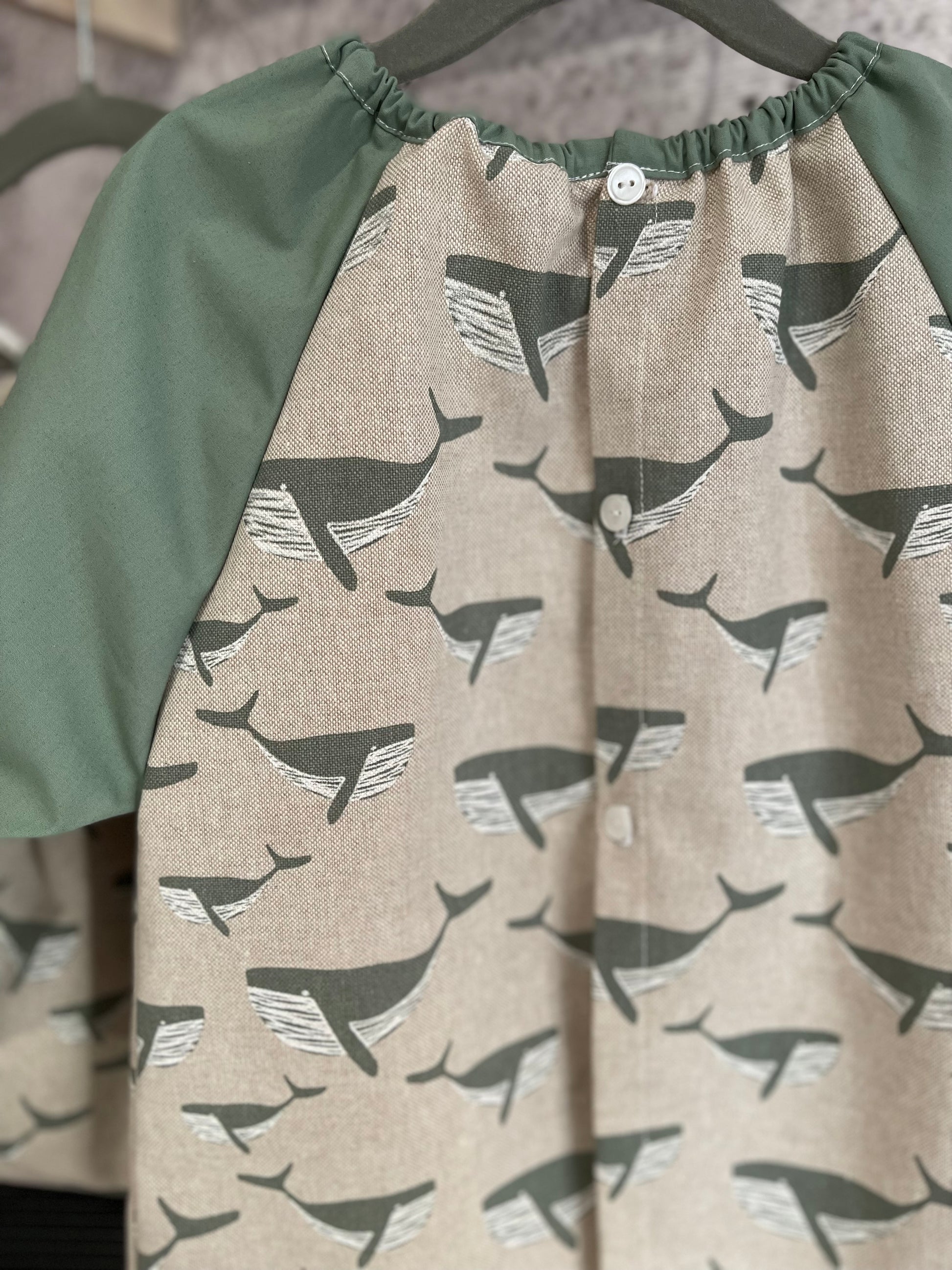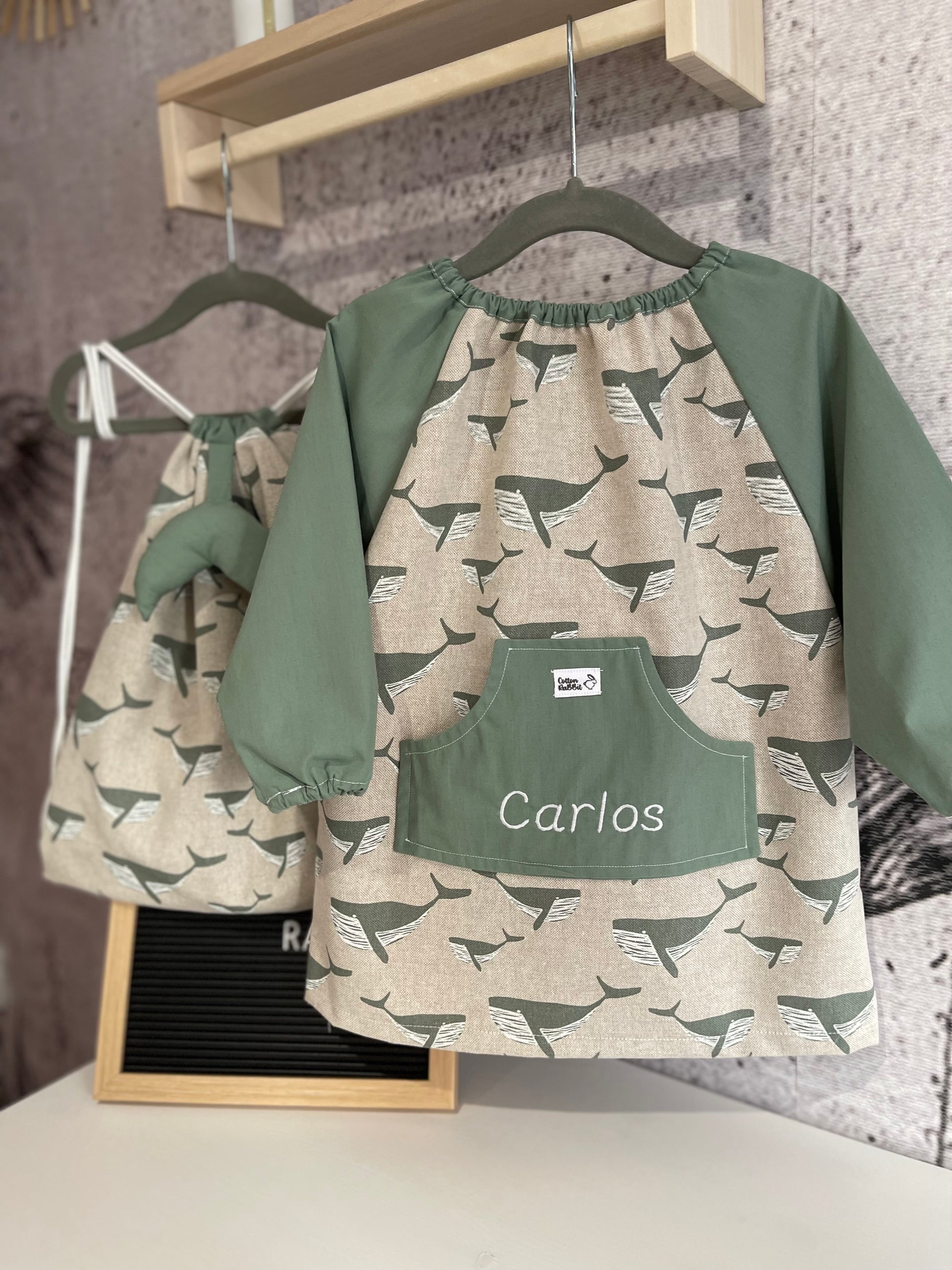 Babi para escuela infantil, en algodón 100% con mangas raglán y bolsillo delantero. Espalda con botones y cuello con elástico para poder sacar sin desabotonar.