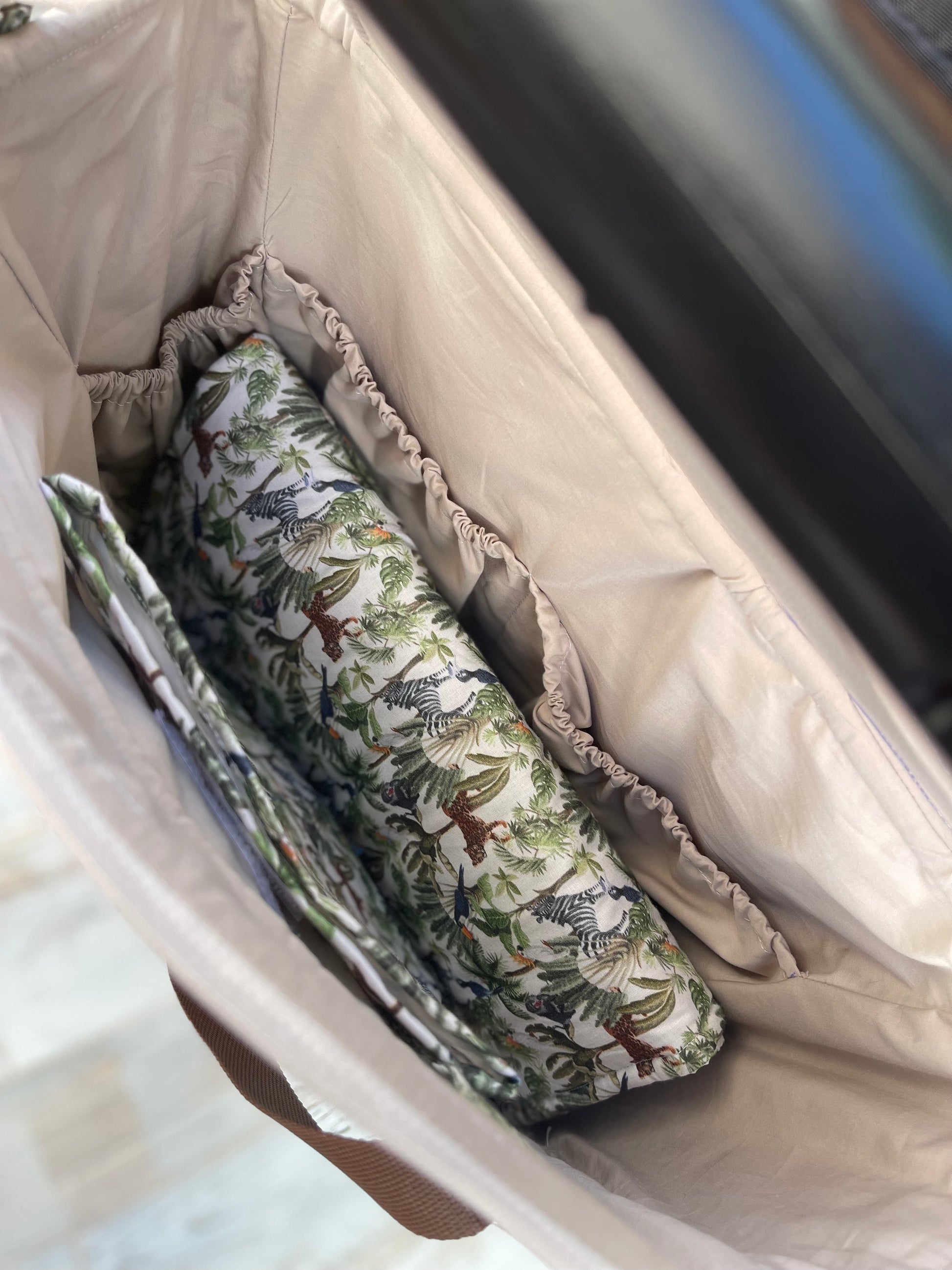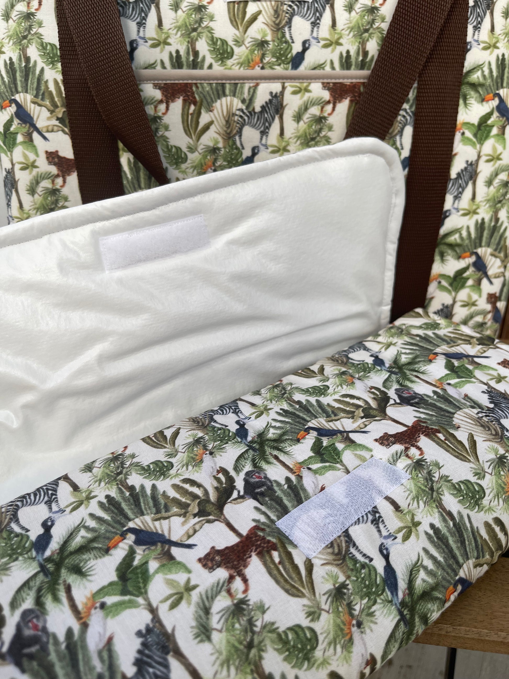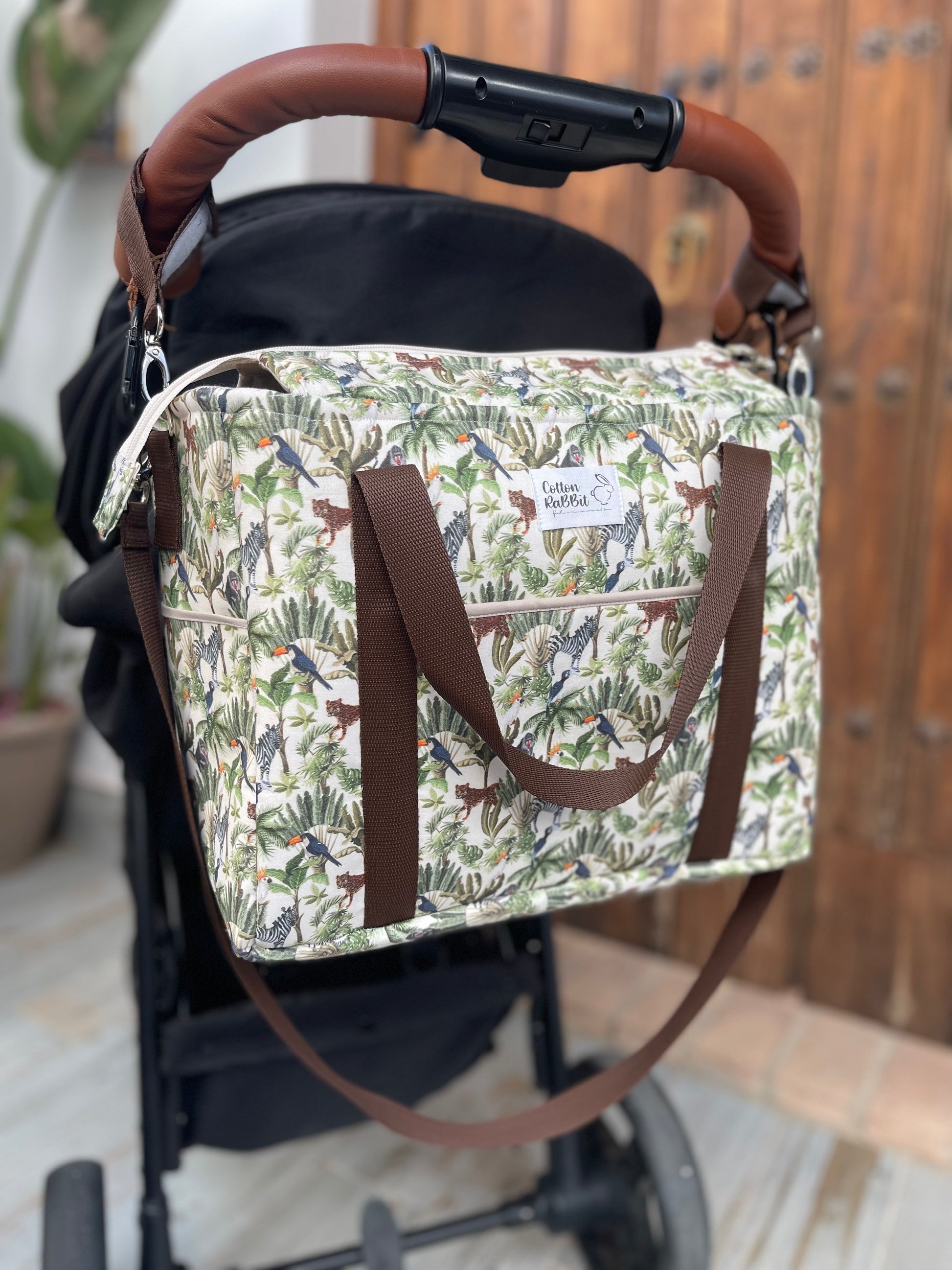 - Posee un cambiador de viaje a juego con el bolso, una tira para encontrar rápidamente las llaves y correas para el asa del carro así como otra larga de hombro.