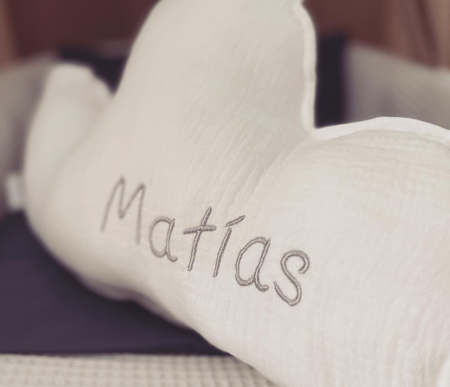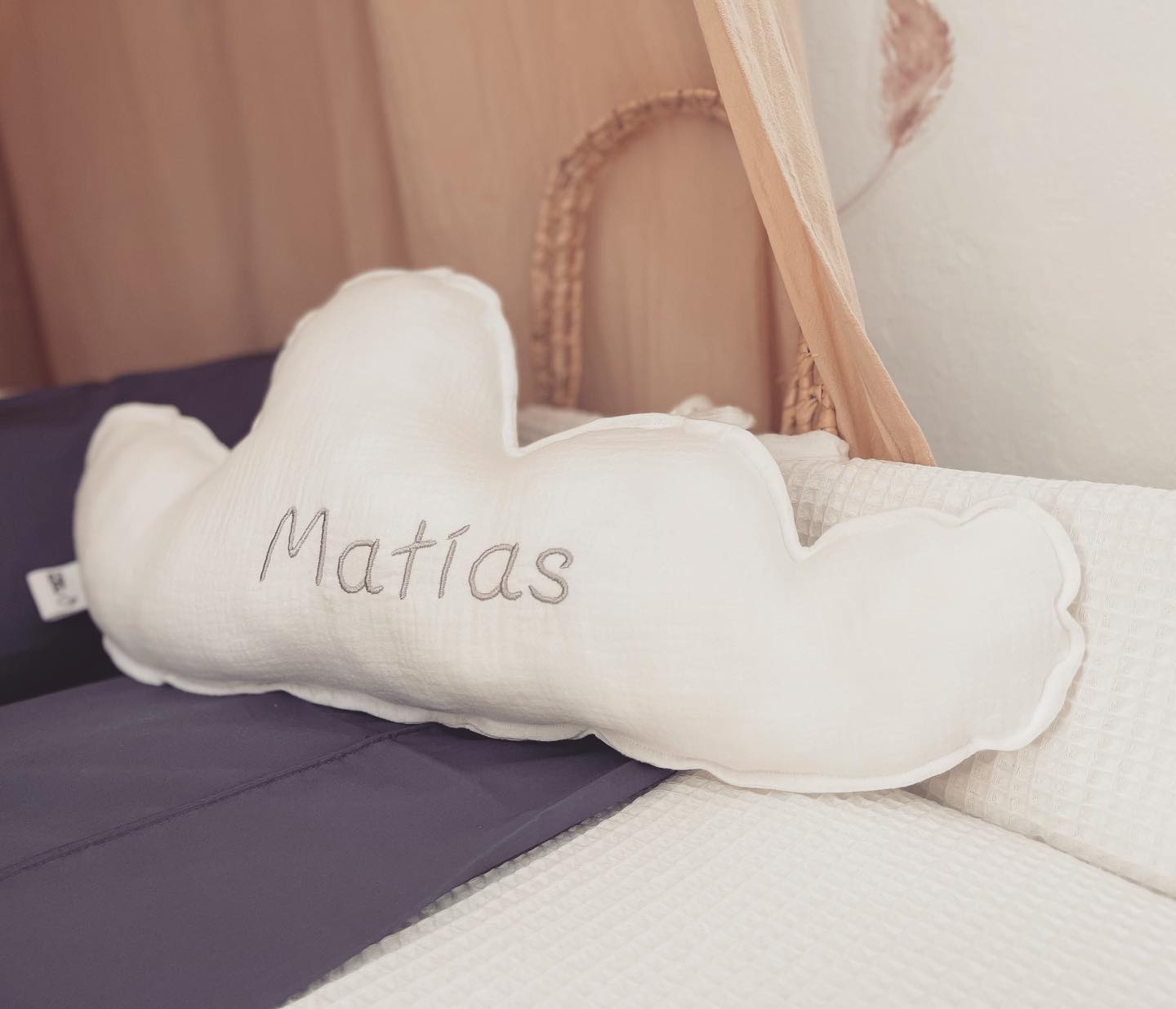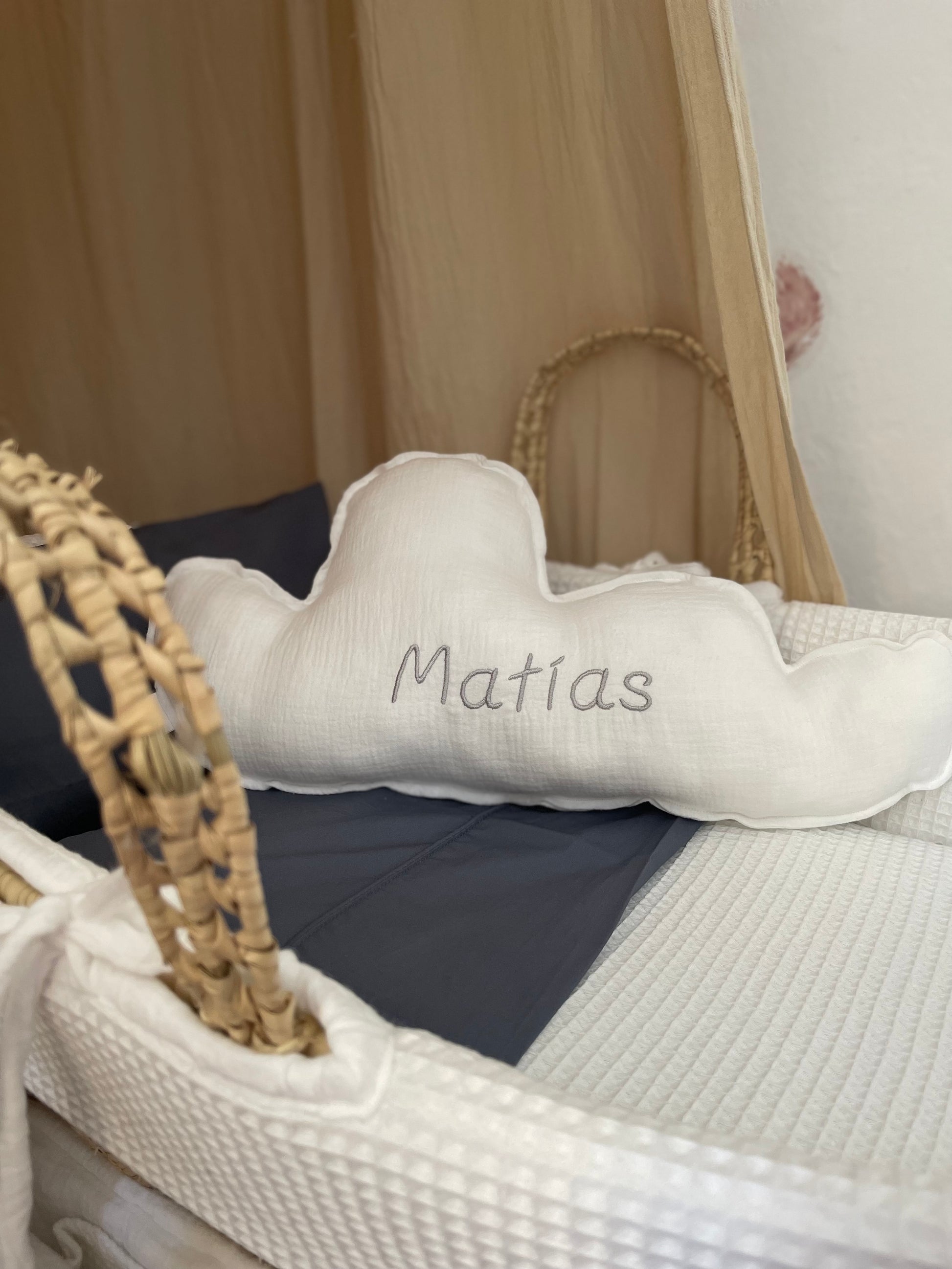 - Cojín antivuelco personalizado con forma de nube, 100% bambula orgánica. Relleno poliéster.