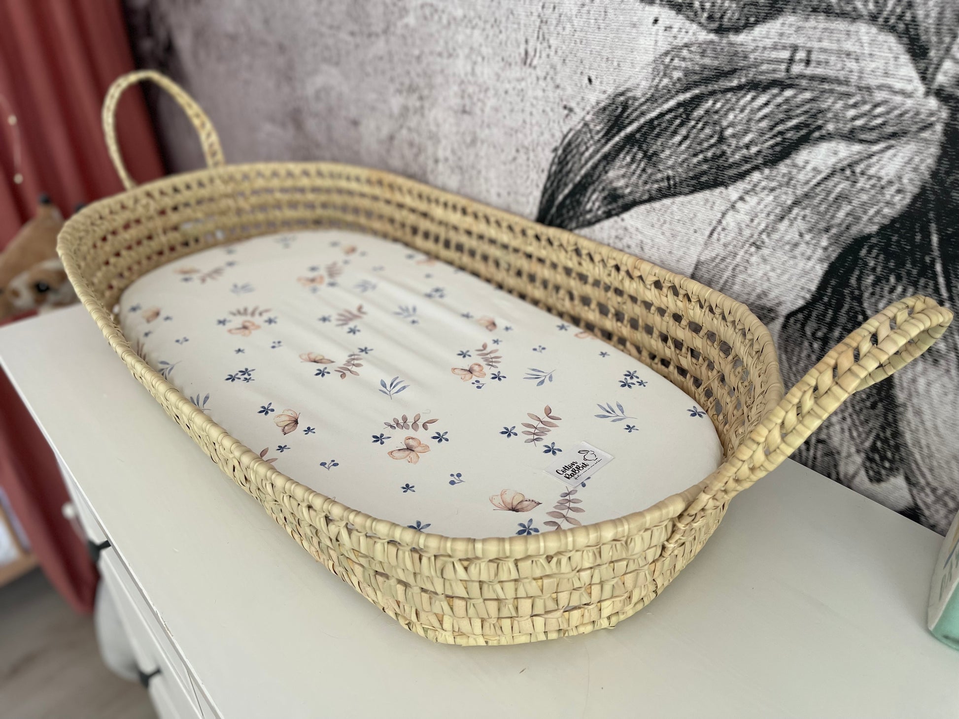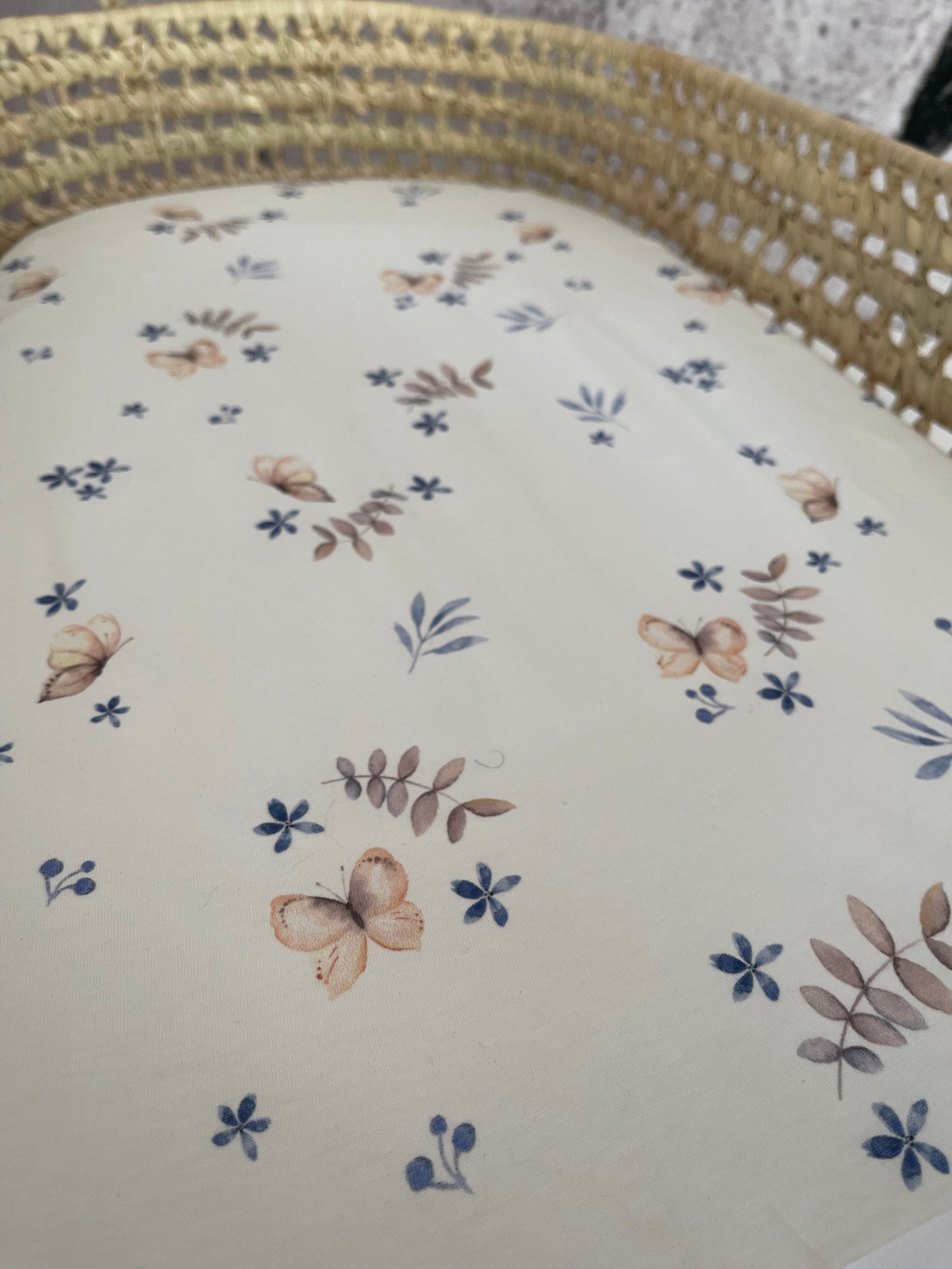 - Funda en tejido de punto para colchón de cambiador (fibras naturales) en estampado Butterfly.