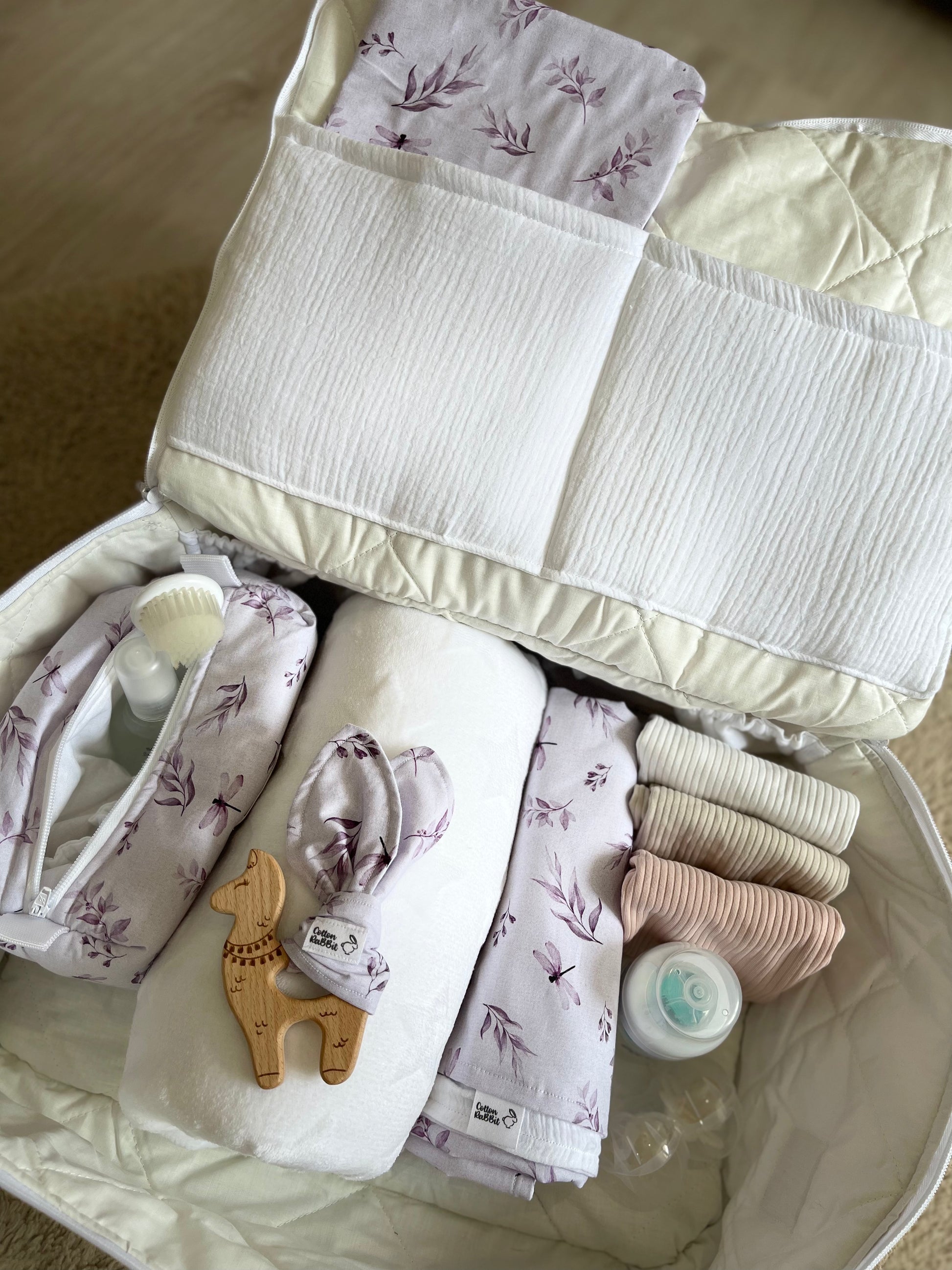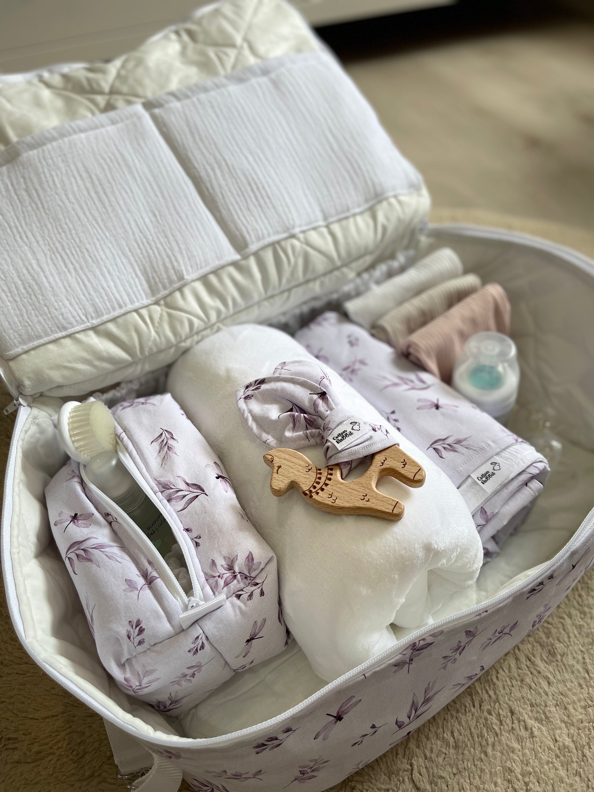 Es ideal como maleta de hospital, así como maleta de viaje para el bebé. Puedes encontrar el porta documentos y el neceser compañero.