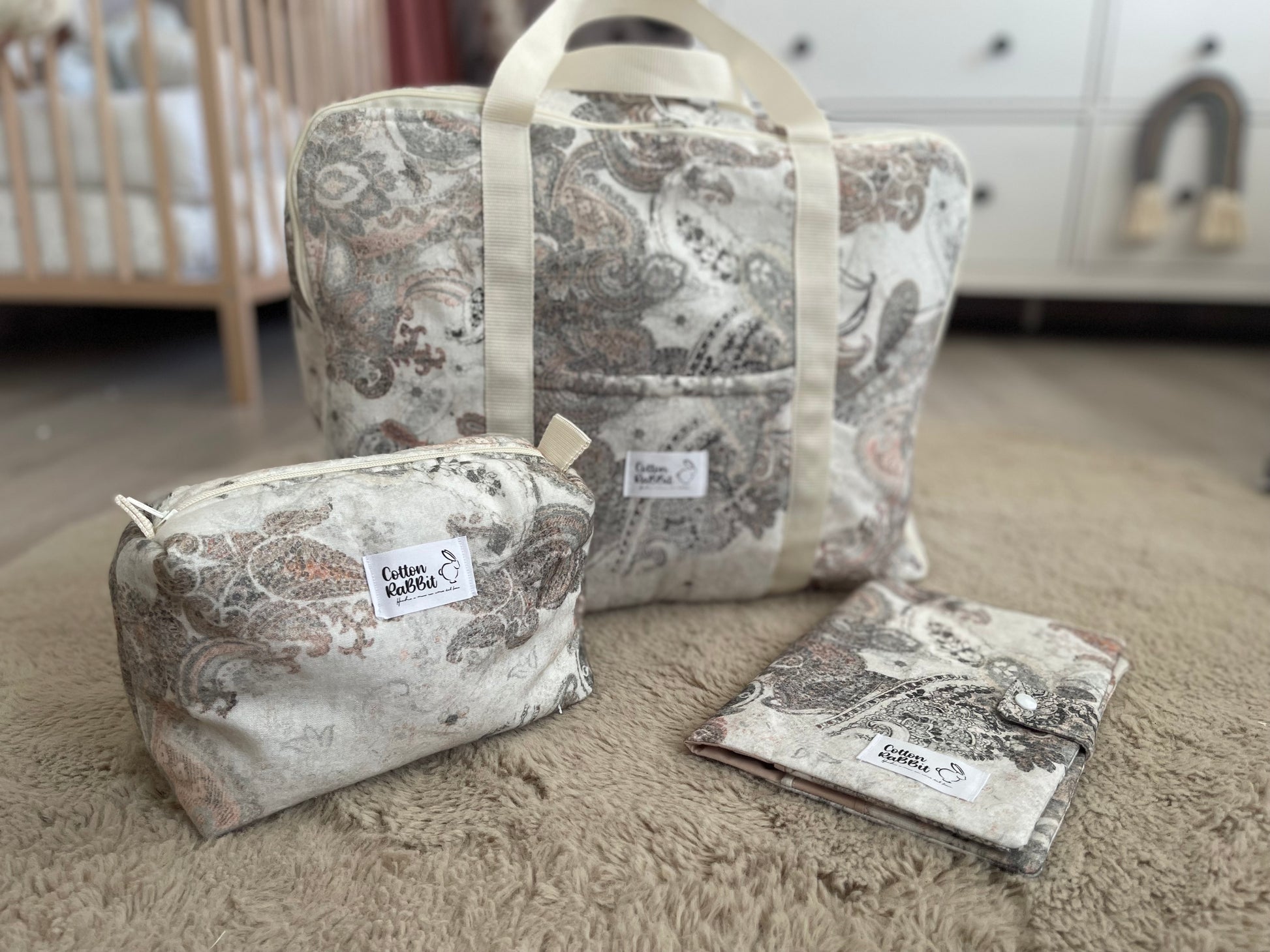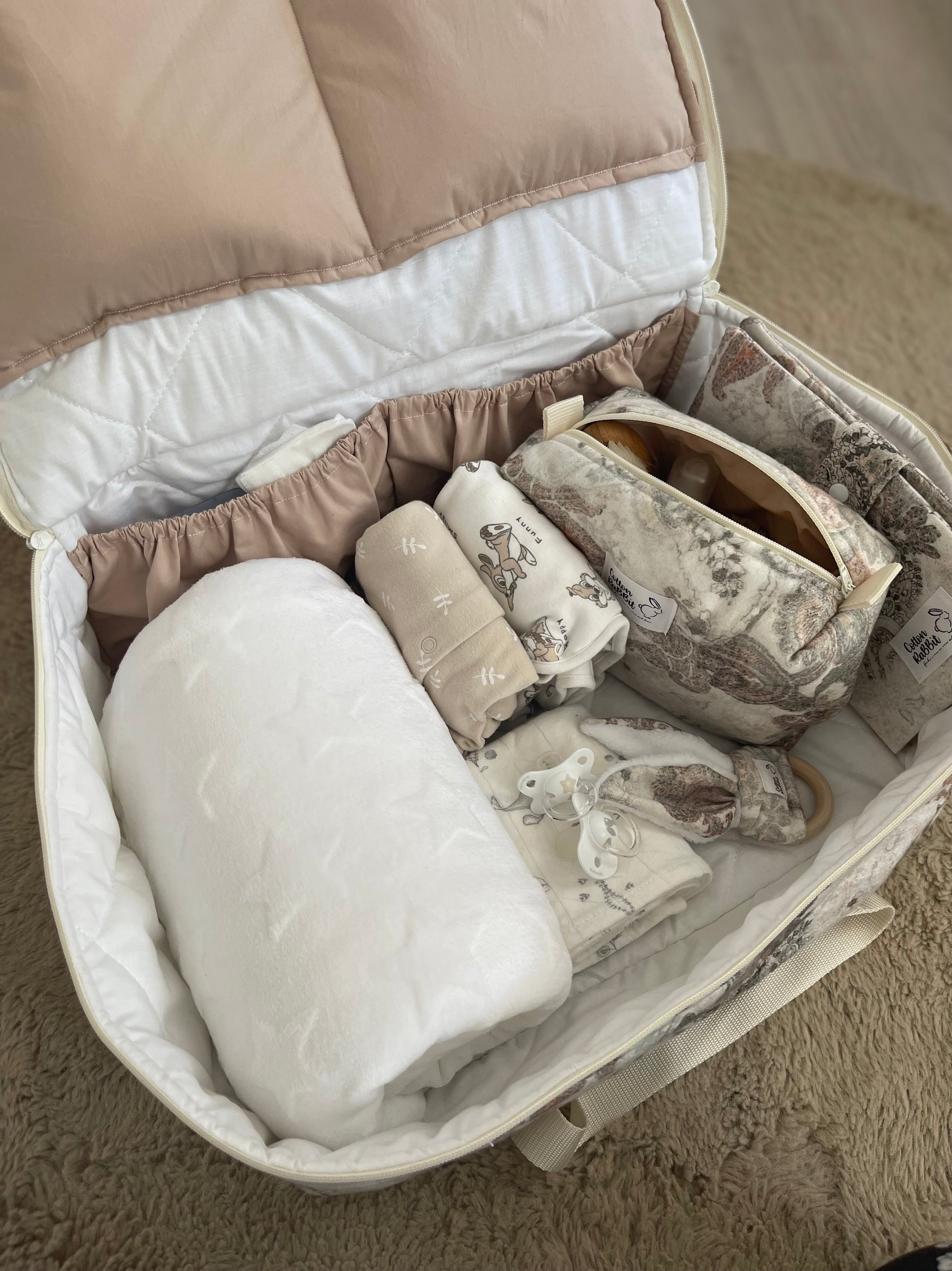 Es ideal como maleta de hospital, así como maleta de viaje para el bebé. Puedes encontrar el porta documentos y el neceser compañero.