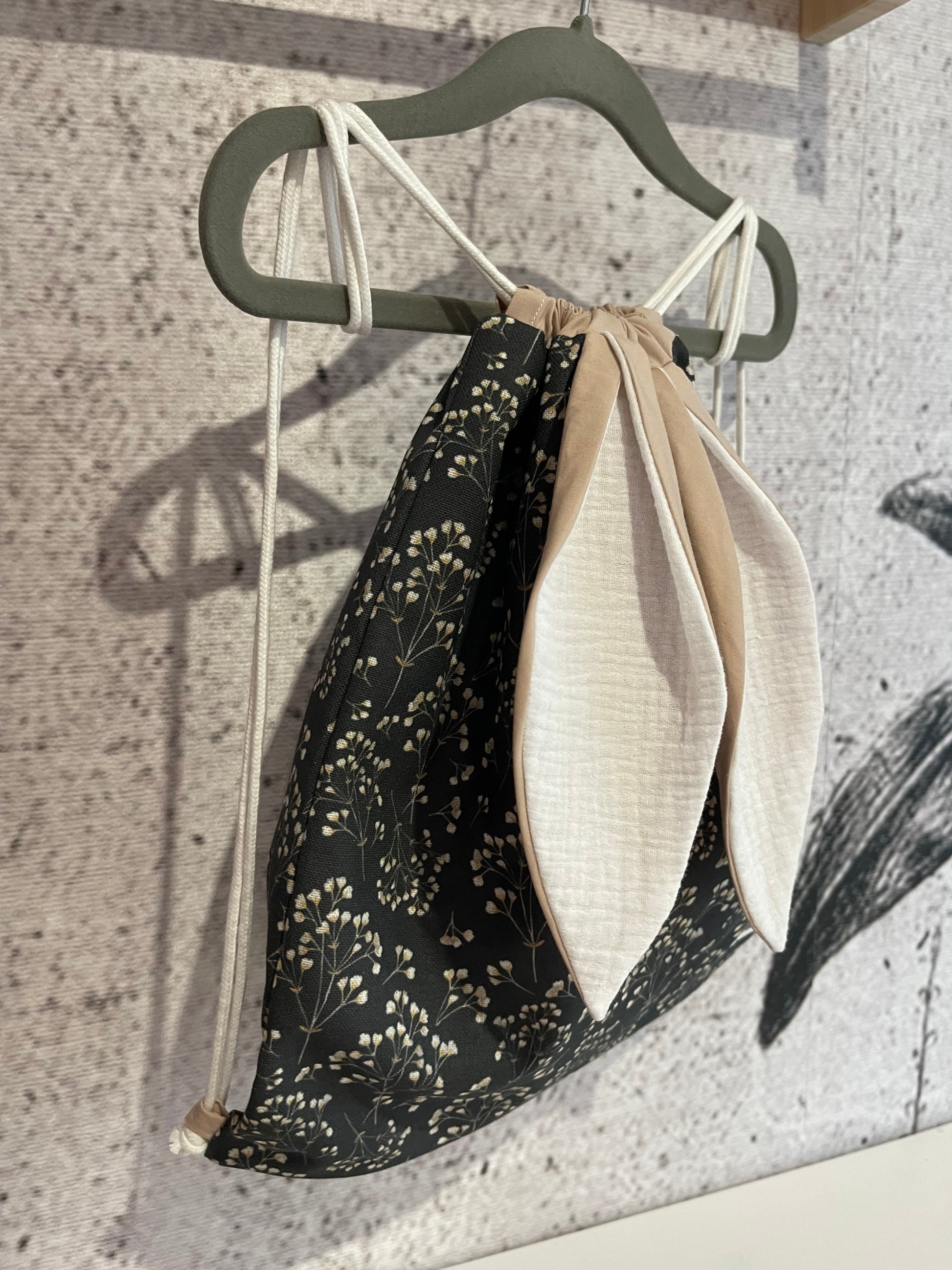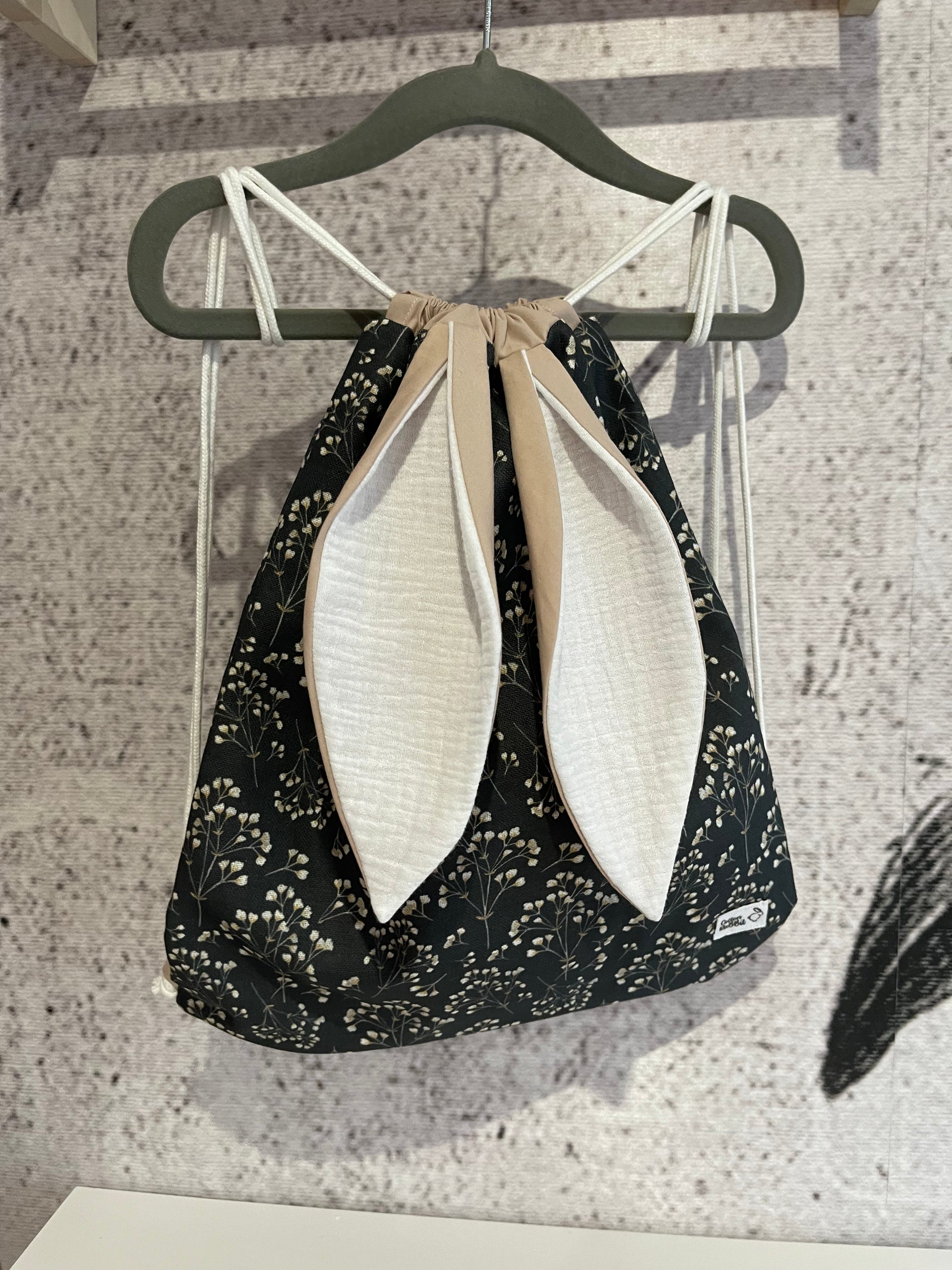 Mochila tipo saco en algodón 100%, exterior en estampado de paniculata e interior en color beige liso con cuerdas de algodón blancas. Detalle orejitas de conejo en bambula blanca y algodón beige. Ideal para llevar mudas o merienda.
